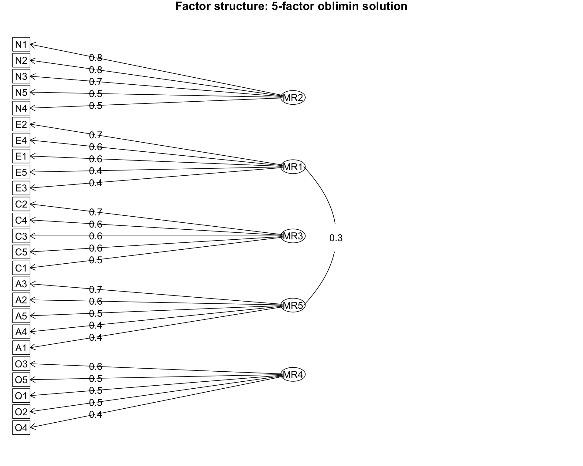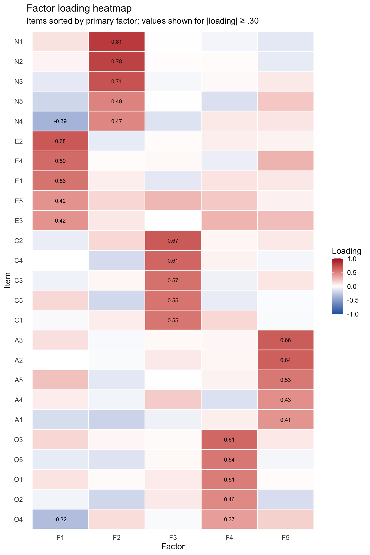 Identifying the factors: Notice that fa() output calls the factors MR1, MR2, etc. These numbers are arbitrary and depend on the extraction math, not psychological theory. To figure out “Which factor is which?”, look at the heatmaps or the path diagram to see which items load highest. For example, if the Agreeableness items (A1-A5) all load strongly on MR2, then MR2 is the Agreeableness factor. It’s a best practice to rename factors so they are interpretable.