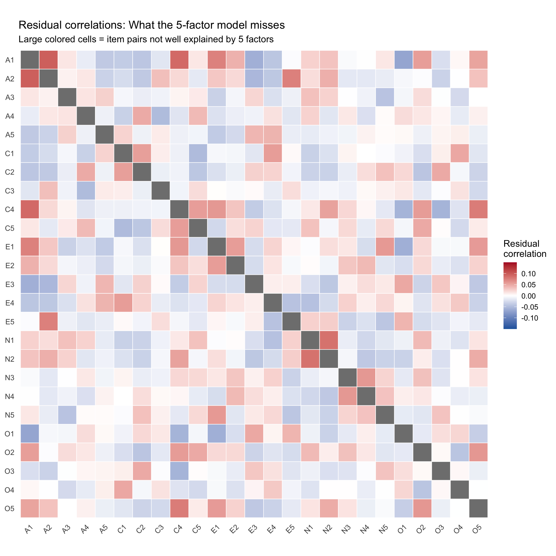 # Extract residual correlation matrix from the fa objectresid_mat <- fa_5$residual# Zero out the diagonal (residual variances are not interesting here)diag(resid_mat) <-NA# Convert to long formatresid_long <- resid_mat %>%as.data.frame() %>%mutate(item1 =rownames(.)) %>%pivot_longer(-item1, names_to ="item2", values_to ="residual") %>%mutate(item1 =factor(item1, levels =colnames(resid_mat)),item2 =factor(item2, levels =rev(colnames(resid_mat))) )ggplot(resid_long, aes(x = item1, y = item2, fill = residual)) +geom_tile(color ="white", linewidth =0.3) +scale_fill_gradient2(low ="#2166ac", mid ="white", high ="#b2182b",midpoint =0, limits =c(-0.15, 0.15), oob = squish,name ="Residual\ncorrelation" ) +labs(title ="Residual correlations: What the 5-factor model misses",subtitle ="Large colored cells = item pairs not well explained by 5 factors",x =NULL, y =NULL ) +theme_minimal(base_size =12) +theme(axis.text.x =element_text(angle =45, hjust =1),panel.grid =element_blank() ) +coord_fixed()