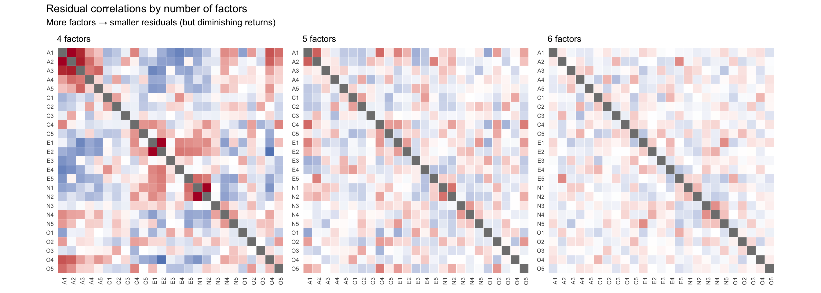# Helper function to create a residual heatmapmake_resid_heatmap <-function(fa_obj, title_label) { resid_m <- fa_obj$residualdiag(resid_m) <-NA resid_m %>%as.data.frame() %>%mutate(item1 =rownames(.)) %>%pivot_longer(-item1, names_to ="item2", values_to ="residual") %>%mutate(item1 =factor(item1, levels =colnames(resid_m)),item2 =factor(item2, levels =rev(colnames(resid_m))) ) %>%ggplot(aes(x = item1, y = item2, fill = residual)) +geom_tile(color ="white", linewidth =0.2) +scale_fill_gradient2(low ="#2166ac", mid ="white", high ="#b2182b",midpoint =0, limits =c(-0.15, 0.15), oob = squish ) +labs(title = title_label, x =NULL, y =NULL) +theme_minimal(base_size =9) +theme(axis.text.x =element_text(angle =90, hjust =1, size =7),axis.text.y =element_text(size =7),panel.grid =element_blank(),legend.position ="none" ) +coord_fixed()}p4 <-make_resid_heatmap(fa_4, "4 factors")p5 <-make_resid_heatmap(fa_5, "5 factors")p6 <-make_resid_heatmap(fa_6, "6 factors")p4 + p5 + p6 +plot_annotation(title ="Residual correlations by number of factors",subtitle ="More factors → smaller residuals (but diminishing returns)" )