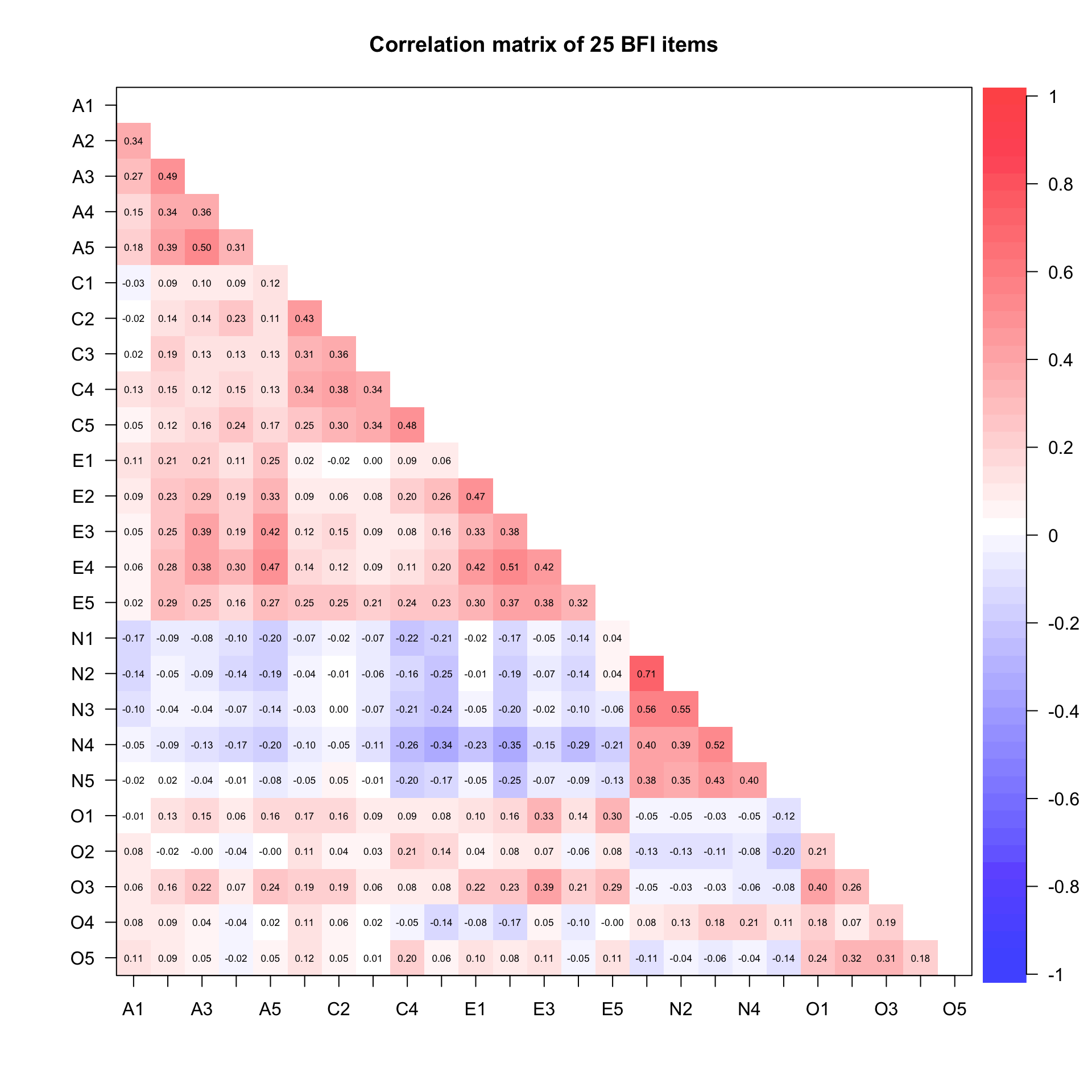 corPlot(bfi_items, upper =FALSE, diag =FALSE, main ="Correlation matrix of 25 BFI items", gr =colorRampPalette(c("blue", "white", "red")), scale =FALSE)