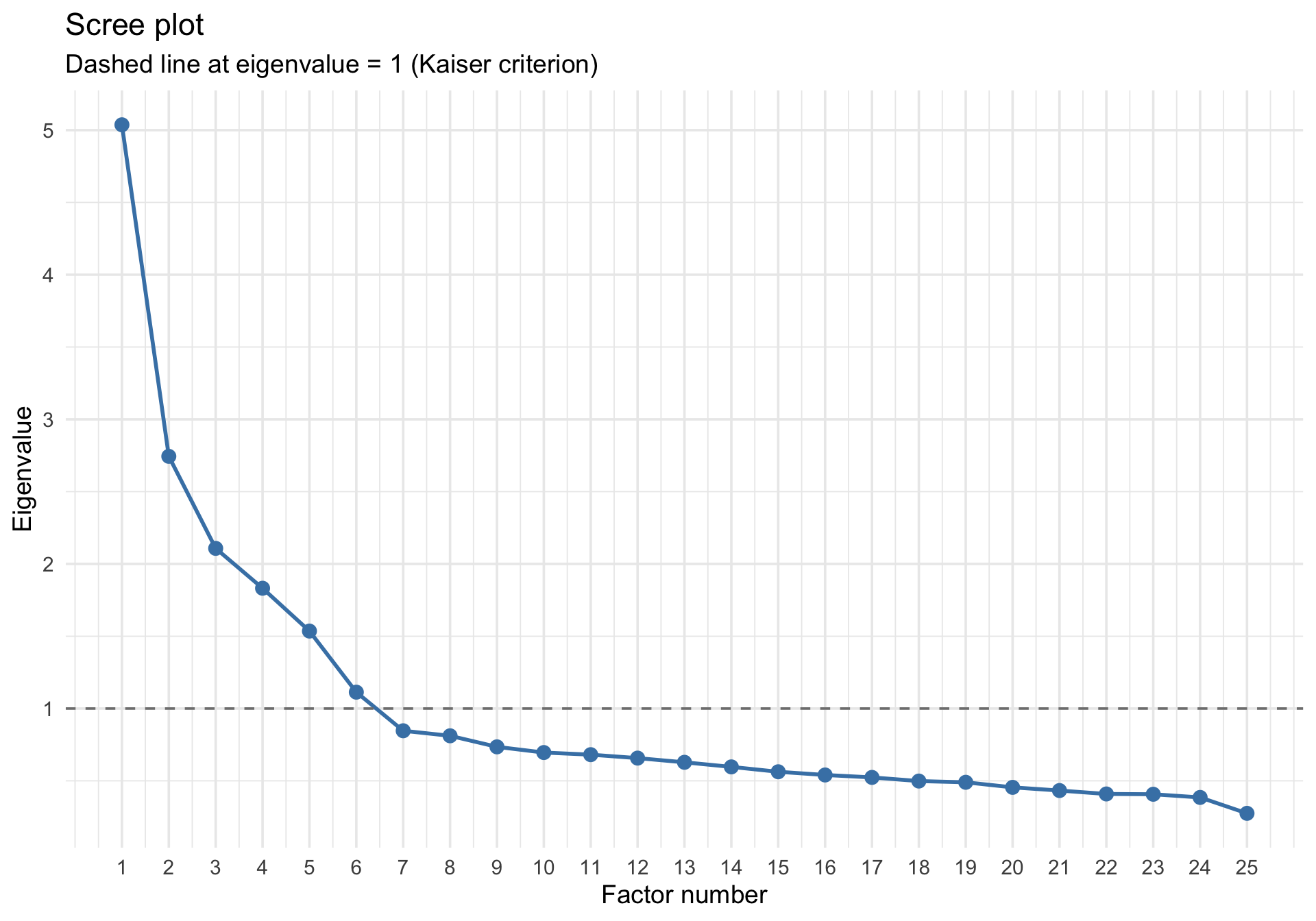 A scree plot shows the eigenvalues of the correlation matrix in descending order. The idea is to look for an “elbow” — a point where eigenvalues drop off sharply. Factors before the elbow capture substantial shared variance; factors after it capture noise.