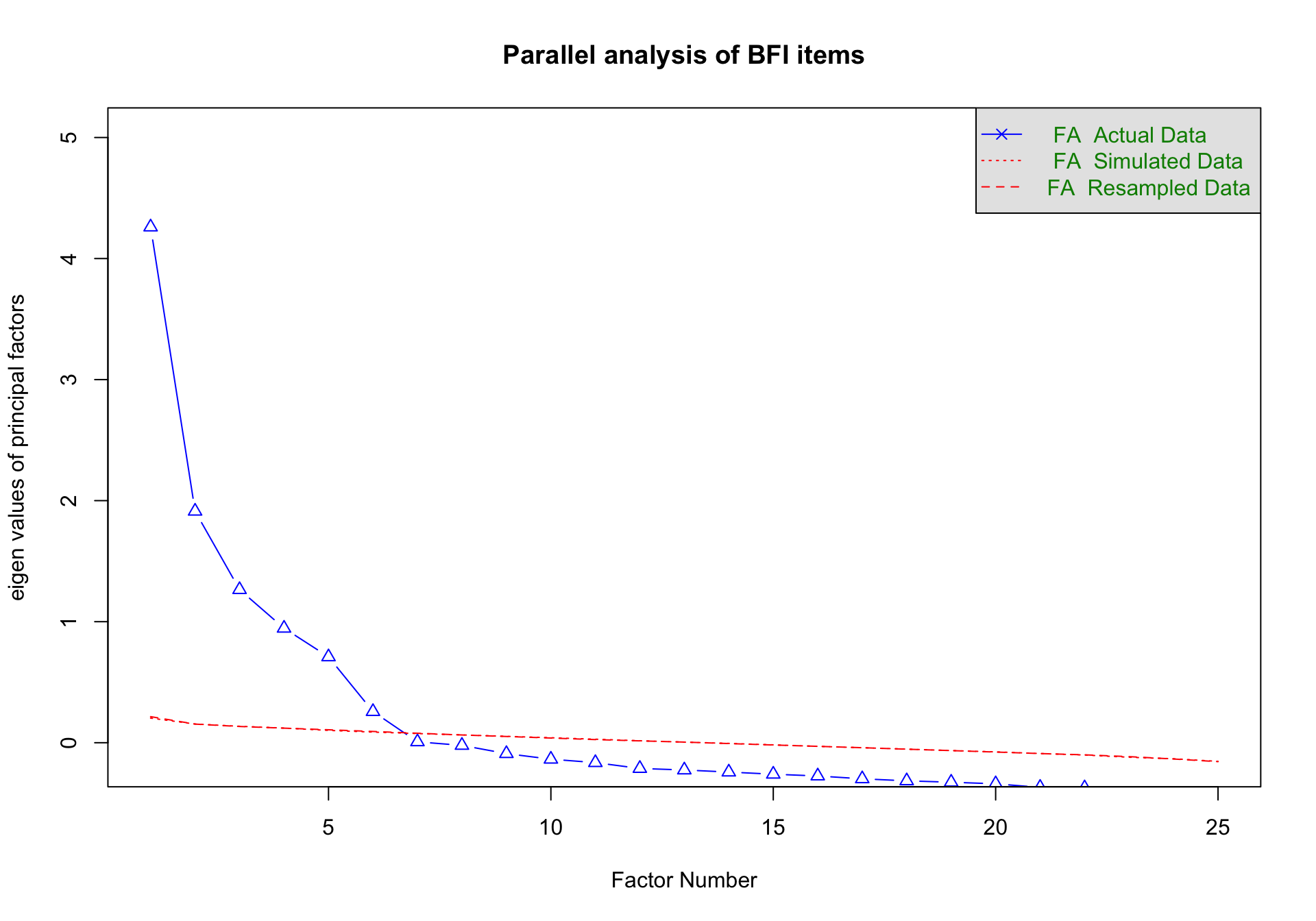 In this plot, the blue line drops below the red lines after the 6th factor. However, parallel analysis can sometimes slightly over-extract.