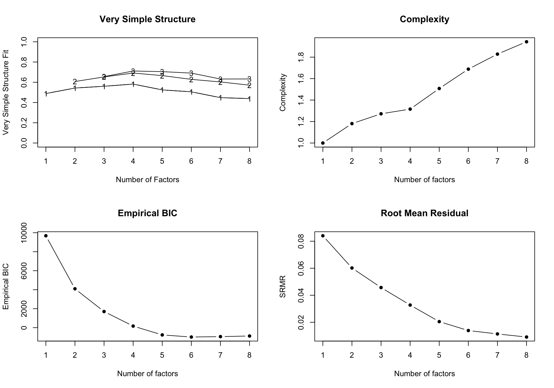 No single test for the number of factors is perfect. As psychometricians often note, parallel analysis can slightly over-extract, while Velicer’s MAP (Minimum Average Partial) test can sometimes under-extract. The VSS (Very Simple Structure) criterion assesses how well the data are fit by factors of varying complexity.