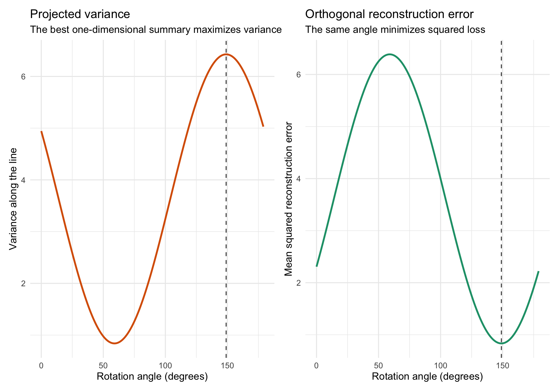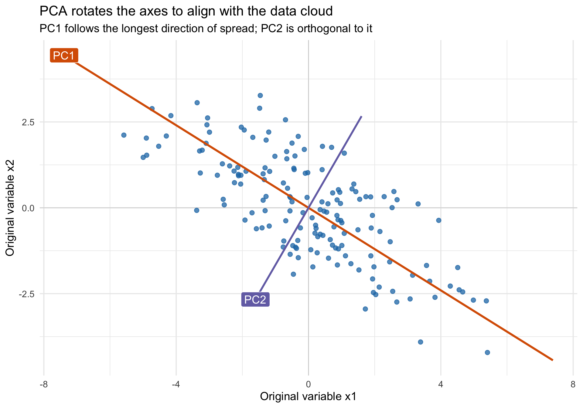 subtitle = "PC1 follows the longest direction of spread; PC2 is orthogonal to it",